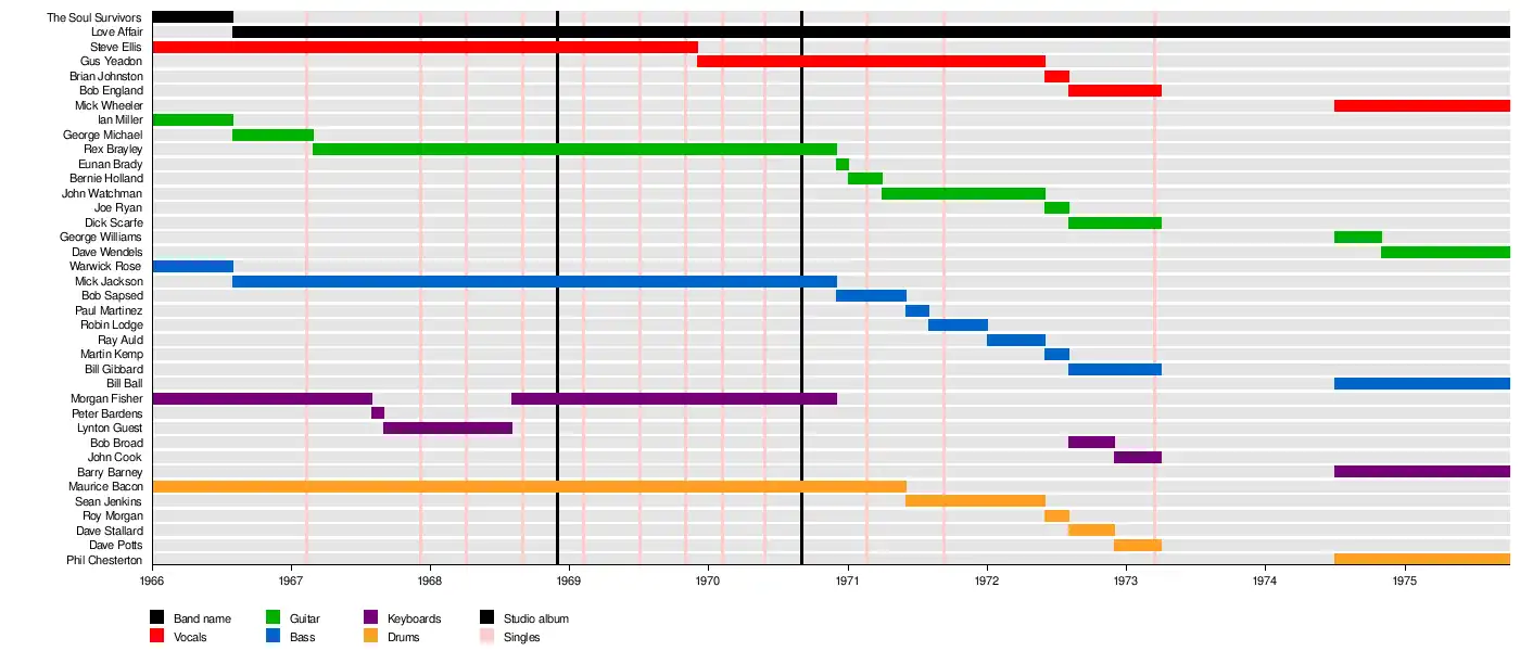 The band was formed in February 1966 as The Soul Survivors, with the original lineup of Steve Ellis (vocals), Ian Miller (guitar), Warwick Rose (bass), Morgan Fisher (keyboards), and Maurice Bacon (drums).[2] In August 1966, Miller and Rose left and George Michael and Mick Jackson took their place. Also in August 1966, they signed to Decca Records, and the bands name was changed to Love Affair. Love Affair's first single, "She Smiled Sweetly", written by Mick Jagger and Keith Richards and released on Decca Records, flopped. George Michael left after "She Smiled Sweetly", in March 1967 and was replaced by Rex Brayley. Fisher's mother wanted him to continue his education, meaning he was forced to leave the band, and after being briefly replaced by Peter Bardens,[3] was permanently replaced by Lynton Guest in September 1967[4] - "I joined the band when I was still at school, and then various people convinced me I ought to stay at school to finish my 'A' Levels. So I left them for about six months, during which time they had a number one hit. I had no plan to come back, but after they had a number one hit" (Morgan Fisher)[2]
