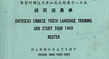 The Study Tour program was started in 1967 by the China Youth Corps.[3] According to the Chinese Canadian Archive,[4] the original name of the program was the "Overseas Chinese Youth Language Training and Study Tour" and was initially promoted across North America through various local Chinese newspapers by Chinese North Americans with relations to the Kuomintang party. The primary goal of the program was to acquaint, or re-acquaint, young people of Chinese descent living in other parts of the world with Chinese culture and language. Thus, participants take brief courses in language and arts, attend lectures, and take scenic tours of Taiwan.