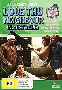 Love Thy Neighbour is a seven-episode Australian television sitcom which debuted on ATN-7 in Sydney on 9 April 1980.[1] Most of the episodes were broadcast in Melbourne beginning the following month.[2] It was produced as a sequel to the British series Love Thy Neighbour (1972–1976) featuring one of the major protagonists Eddie Booth (Jack Smethurst).[3] The central concept is that Eddie has relocated to Australia and intends to send for his wife and child once he has settled. While the earlier series had focused on Eddie's rivalry with his neighbour Bill Reynolds, the sequel focused on a new set of relationships unrelated to the original show's premise. Here, he is boarding with a married couple, Joyce and Bernard, and conflicting with his Dutch-Australian next door neighbour, Jim Lawson, played by Russell Newman. External scenes were shot in Auburn Road, Auburn NSW with 191 Auburn Road serving as Joyce, Bernard and Eddie's home.