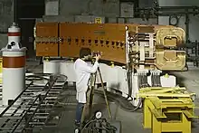 LEAR is a multipurpose storage ring located in the South Hall of the Proton Synchrotron (PS), with a circumference of 78.5 m.[3][4] Four straight sections are alternated with compact 90° bending magnets, along with eight quadrupole doublets. The straight sections each consist of an 8m long section, where equipment such as apparatus for internal beams and electron cooling can be stored, and two short sections of 1m.[4] The C-type (bending) magnets used are open to the outside of the ring for injection and ejection.[5] The vacuum system used for LEAR is designed for baking at 300 °C.[3]