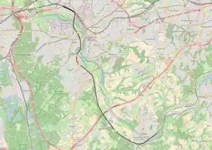The first passenger services in 1876 ran from Kettwig over the Kettwig railway bridge and the Ruhr bridge in Mülheim to the Mülheim station of the BME,[2] which was later renamed as Mülheim (Ruhr) and is now Mülheim (Ruhr) West.[3] The passenger service was moved in 1909 to Styrum[4] because the connecting curve to Mülheim BME was upgraded for the expansion of Friedrich Wilhelms-Hütte steel works and Mülheim (Ruhr) West station was in the way. At the end of World War II, the two Ruhr bridges were destroyed.[2] Consequently, passenger services from Mülheim had to stop short of the Ruhr bridge at Kettwig and later a station was built there called Kettwig Stausee ("Kettwig reservoir", below the current S-Bahn station of the same name) as a terminus.[5] In Mülheim, the passenger service was diverted over the Broich connecting curve to Speldorf. After the re-establishment of the Mülheim bridge in 1954 both of the north-west end points (Styrum and Speldorf) were served until the abandonment of passenger services in 1968.[2]