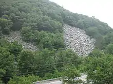 Yellow Creek flows eastward through the gap towards its junction with the Raystown Branch of the Juniata River. Periglacial boulder fields are present on both sides of the water gap, and the boulders are formed of the Silurian Tuscarora Formation.[1]