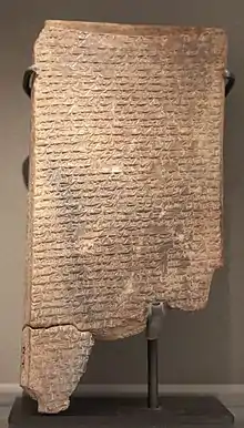 A tablet recovered in Nippur lists grain rations given to the messenger of a certain Šubši-mašrâ-Šakkan during Nazi-Marrutaš' fourth year (1304 BC).[9] There is a court order found in Ur, dated to the sixteenth year of Nazi-Maruttaš (1292 BC), in which Šubši-mašrâ-šakkan is given the title šakin māti, lúGAR KUR, "governor of the country." It is an injunction forbidding harvesting reeds from a certain river or canal.[10]