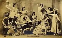 Act II of La Bayadère. In the center is Mathilde Kschessinskaya as Nikiya (right) kneeling with Vera Trefilova (left) who performed the Danse manu. Standing toward the right is Pavel Gerdt as Solor with Olga Preobrajenskaya as Gamzatti. St. Petersburg, 1900.