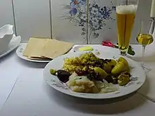 In Norway, Sweden and Finland, lutefisk is a part of the Christmas tradition and is mostly eaten with boiled potatoes, green peas and white sauce. Regional variations include a sprinkle of freshly ground allspice or black pepper and the addition of coarsely ground mustard in the white sauce (in Scania). In parts of Jämtland it is served on flatbread with whey cheese.[7]