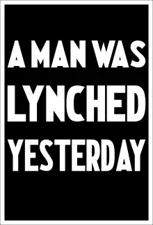 After the lynching, photographers would sell their pictures as-is or as postcards, sometimes costing as much as fifty cents a piece, or $9, as of 2016.[91] Though some photographs were sold as plain prints, others contained captions. These captions were either straightforward details—such as the time, date and reasons for the lynching—while others contained polemics or poems with racist or otherwise threatening remarks.[92] An example of this is a photographic postcard attached to the poem "Dogwood Tree", which says: "The negro now/By eternal grace/Must learn to stay in the negro's place/In the Sunny South, the land of the Free/Let the WHITE SUPREME forever be."[95] Such postcards with explicit rhetoric such as "Dogwood Tree" were typically circulated privately or mailed in a sealed envelope.[96] Other times these pictures simply included the word "WARNING".[92]