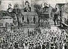 Collective violence was a familiar aspect of the early American legal landscape, with group violence in colonial America being usually nonlethal in intention and result. In the 17th century, in the context of the Wars of the Three Kingdoms in the British Isles and unsettled social and political conditions in the American colonies, lynchings became a frequent form of "mob justice" when the authorities were perceived as untrustworthy.[7] In the United States, during the decades after the Civil War, African Americans were the main victims of racial lynching, but in the American Southwest, Mexican Americans were also the targets of lynching as well.[8]