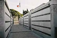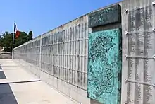 A remembrance wall was also inaugurated in 1996.[5] The wall is 64m long, crossing the main building are inscribed, on 438 plaques, on either side of a bronze map of Indochina, 34,935 names of soldiers killed during the Indochina war whose bodies do not rest in Fréjus (missing, left behind or returned to families). The names are arranged by year of death and then listed in alphabetical order.