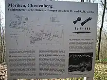 The area was settled in the Late Bronze Age. The hilltop settlement on the Kestenberg had at least two phases (approximately 1050 to 1000 BC and 850 BC.). In the more recent settlement, the buildings were built with logs and traces of constructions and traces of bronze casting were discovered. A Roman era wall at the Lehmgrube river indicates that there was a Roman farm in the area. Möriken-Wildegg is first mentioned in 1283 as de Moerinchon.[3] In the High Middle Ages the village belonged to the Lords of Holderbank and then later to the Twingherrschaft of Wildegg.