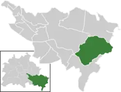 Müggelheim, surrounded by the Berliner Stadtforst,[4] lies in the southeastern suburbs of Berlin, at the borders with the Brandenburg municipalities of Erkner and Gosen-Neu Zittau, Oder-Spree district. It borders on the Berlin localities of Rahnsdorf, Köpenick, Grünau and Schmöckwitz.