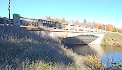 The bridge carrying M-28 over the Sand River is a medium-span concrete bridge 56 feet (17 m) long and 40.4 feet (12.3 m) wide supported by concrete abutments. The span has a shallow arch, 4 feet (1.2 m) thick at the abutments and 1 foot 8 inches (0.51 m) at the center of the span. It has a so-called rigid-frame construction, which was a new development by the highway department at the time the bridge was built. The bridge has concrete and steel guardrails and horizontal Art Moderne scoring on the sidewalls of the abutments.[2] Despite its age, the bridge remains in excellent condition.[2]