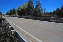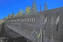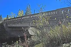 The M-28–Tahquamenon River Bridge is plate girder bridge built of nine steel girders encased in concrete.[3] The girders are braced by concrete diaphragms and sit on large concrete abutments. The bridge spans 55 feet (17 m), and is 35 feet (11 m) wide with a 30-foot-wide (9.1 m) roadway. A concrete deck covered with asphalt sits atop the bridge, and the roadway is lined with concrete guardrails made from fluted balusters and paneled bulkheads.[2]