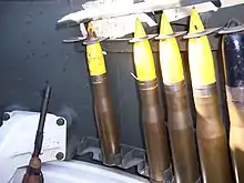 The vehicle carried 80 37 mm rounds (16 in the turret and 64 in an ammunition rack in the right sponson) when fitted with a single radio. Vehicles with a second radio installed only carried 16 main gun rounds. Some units solved this problem by cutting up the removed main ammunition rack and stowing 18 rounds in each sponson, under the radios. This raised the number of main gun rounds able to be carried to 52. Another modification (the most common one) involved fabricating (again from the discarded main ammunition rack) a 43-round bin to be placed behind the driver's seat, and a 20-round bin attached to the framing of the turret basket. This raised the ammunition capacity up to 79 rounds.[1] Machine gun ammunition consisted of 1,500 .30 caliber rounds and 400 .50 caliber rounds. In addition, the vehicle carried a mix of six Mk 2 fragmentation grenades, 6 MK 3 offensive grenades, four smoke grenades, and four M1 carbines for the crew, and six M1 anti-tank mines.[9]