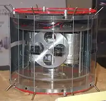 MINERVA-II-1 was developed by JAXA and the University of Aizu. It has a slim design compared to its predecessor, to increase the likelihood the surface with larger area would contact the asteroid surface. MINERVA-II-1 was enlarged from its predecessor as the rover's destination, asteroid Ryugu was more distant from the Sun than Itokawa, necessitating an increase in solar cell area.[12] Ryugu's greater size compared to Itokawa means rovers will face stronger gravity, thus larger DC motors are used for MINERVA-II-1.[13] By deploying two rovers simultaneously, a network of space probes can be achieved.[9] The maximum communication speed between the MINERVA-II-1 rovers and the mothership's OME-E is 32 kbps. The two rovers are nearly identical, the only difference being some internal sensors and the thermal characteristics.[14] Rover-1A uses a traditional multi-layer insulation, which covers the rover to prevent heat from entering, while Rover-1B is equipped with radiators to dissipate heat to the outside.[15]
