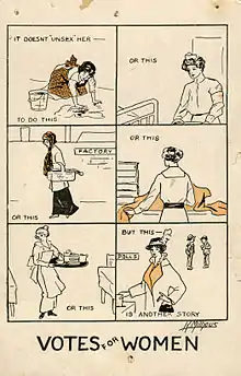 Women's suffrage was not a major topic within the women's rights movement at that point. Many of its activists were aligned with the Garrisonian wing of the abolitionist movement, which believed that activists should avoid political activity and focus instead on convincing others of their views with "moral suasion".[47] Many were Quakers whose traditions barred both men and women from participation in secular political activity.[48] A series of women's rights conventions did much to alter these attitudes.