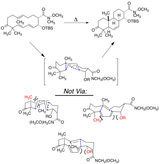 Similar to intermolecular reactions, intramolecular reactions can show significant stereoselectivity from the ground state conformation of the molecule. In the intramolecular Diels-Alder reaction depicted below, the lowest energy conformation yields the observed product.[23] The structure minimizing repulsive steric interactions provides the observed product by having the lowest barrier to a transition state for the reaction. Though no external attack by a reagent occurs, this reaction can be thought of similarly to those modeled with peripheral attack; the lowest energy conformation is the most likely to react for a given reaction.