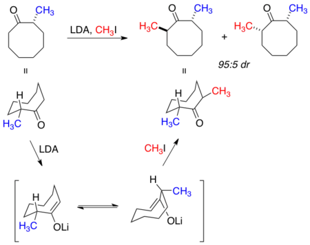Early investigations of macrocyclic stereocontrol studied the alkylation of 8-membered cyclic ketones with varying substitution.[1] In the example below, alkylation of 2-methylcyclooctanone occurred to yield the predominantly trans product. Proceeding from the lowest energy conformation of 2-methylcycloctanone, peripheral attack is observed from either one of the low energy (energetic difference of 0.5 (kcal/mol)) enolate conformations, resulting in a trans product from either of the two depicted transition state conformations.[22]