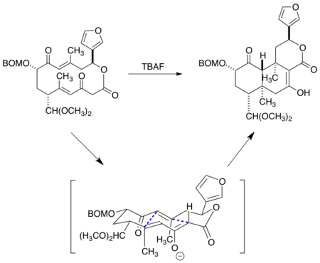 Reaction classes used in synthesis of natural products under the macrocyclic stereocontrol model for obtaining a desired stereochemistry include: hydrogenations such as in neopeltolide [7] and (±)-methynolide,[8] epoxidations such as in (±)-periplanone B[9] and lonomycin A,[10] hydroborations such as in 9-dihydroerythronolide B,[11] enolate alkylations such as in (±)-3-deoxyrosaranolide,[12] dihydroxylations such as in cladiell-11-ene-3,6,7-triol,[13] and reductions such as in eucannabinolide.[14]