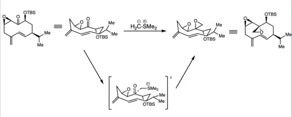 Epoxidation of the ketone was achieved, and can be modeled by peripheral attack of the sulfur ylide on the carbonyl group in a Johnson-Corey-Chaykovsky reaction to yield the protected form of (±)-periplanone B. Deprotection of the alcohol followed by oxidation yielded the desired natural product.