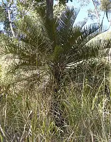 As the sarcotesta is bright, avian and mammalian species are attracted to the seeds.[13] With no toxins in the sarcotesta, smaller fauna including wallabies, possums and crows strip off the sarcotesta, leaving the seed untouched. This would not contribute to the propagation of Macrozamia miquelii as most seeds would be left within a metre of the parent cycad.[14] Larger fauna such as emus and cassowaries have been observed contributing to seed dispersal as the seeds can be ingested and defecated intact without harming the fauna.[15]