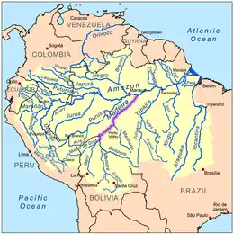 The Madeira River (Portuguese: Rio Madeira [ˈʁi.u mɐˈdejɾɐ]) is a major waterway in South America. It is estimated to be 1,450 km (900 mi) in length, while the Madeira-Mamoré is estimated near 3,250 km (2,020 mi)[4] or 3,380 km (2,100 mi) in length depending on the measuring party and their methods. The Madeira is the biggest tributary of the Amazon, accounting for about 15% of the water in the basin.[5] A map from Emanuel Bowen in 1747, held by the David Rumsey Map Collection, refers to the Madeira by the pre-colonial, indigenous name Cuyari.[6]