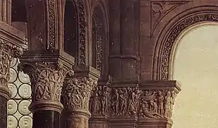 The architecture of the loggia, as in so many of van Eyck's paintings, is in a rich and delicate Romanesque style far from the Gothic styles of his own day. The setting probably represents at the same time an imaginary building in Autun, and the "Heavenly city of Jerusalem"; two personages from two worlds are shown, and their surrounding combines the world of each.