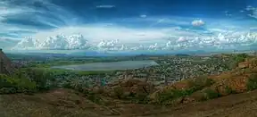 Madurai is located at 9°56′N 78°07′E / 9.93°N 78.12°E / 9.93; 78.12.[60] It has an average elevation of 134 metres. The city of Madurai lies on the flat and fertile plain of the river Vaigai, which runs in the northwest–southeast direction through the city, dividing it into two almost equal halves.[61] The Sirumalai and Nagamalai hills lie to the north and west of Madurai. The land in and around Madurai is utilised largely for agricultural activity, which is fostered by the Periyar Dam.[62] Madurai lies southeast of the western ghats, and the surrounding region occupies the plains of South India and contains several mountain spurs.[63] The soil type in central Madurai is predominantly clay loam, while red loam and black cotton types are widely prevalent in the outer fringes of the city. Paddy is the major crop, followed by pulses, millet, oil seed, cotton and sugarcane.[64]