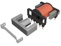 Construction of an inductor using two ER cores, a plastic bobbin and two clips. The bobbin has pins to be soldered to a printed circuit board.