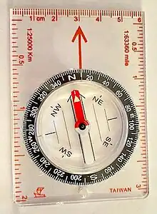 In the image at the right, the bezel's N has been aligned with the direction indicated by the magnetic end of the compass needle, adjusted for local declination (10 degrees east of magnetic north). The direction-of-travel arrow on the baseplate thus reflects a true north heading.