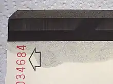 An example of damaged magnetic encoding. A magnet was run across this stripe. The encoding has been made visible by applying a Magnetic Developer solution