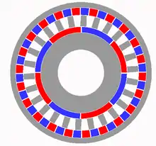 Illustration of the interior and exterior rotors of second-order gears with the ferromagnetic stator in between the rotors.