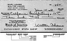 An early demonstration of use of an E-13 MICR font on a cheque. The "transit" glyph differs from E-13B.