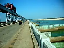 The river traverses Cuttack district in an east–west direction. Just before entering Cuttack, it gives off a large distributary called the Kathjori. The city of Cuttack stands on the spit separating the two channels. The Kathjori then throws off many streams like the Kuakhai, Devi and Surua which fall into the Bay of Bengal after entering Puri district. The Kathjori itself falls into the sea as the Jotdar. Other distributaries of Mahanadi include the Paika, Birupa, Chitroptala river, Genguti and Lun.The Birupa then goes on to join the Brahmani River at Krushnanagar and enters the Bay of Bengal at Dhamra. The Mahanadi proper enters the sea via several channels near Paradeep at False Point, Jagatsinghpur. The combined Delta of the Mahanadi's numerous distributaries and the Brahmani is one of the largest in India.[5][7]