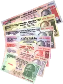 Banknotes of denominations of ₹5, ₹10, ₹20, ₹50, ₹100, ₹500 and ₹1000 of the Mahatma Gandhi Series