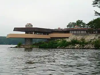 The Frank Lloyd Wright-inspired Massaro House juts into Lake Mahopac on Petre Island