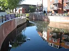 The Royal Borough of Windsor and Maidenhead set up the Partnership for the Rejuvenation of Maidenhead (PRoM) in December 2007,[4] which developed and proposed a 20 Year Vision and Action Plan for rejuvenating the town centre.[5] The comprehensive Area Action Plan was adopted in September 2011, after successive consultations.[6] It saw the restored waterway as one of the defining projects which would help to improve and shape the identity of the town for the future.[7] It also identified opportunity areas, where major developments based around housing and offices could take place. Three of these abutted the waterways, and would be enhanced by having a pleasant water outlook. These were the High Street and York Stream area just to the south of the A4 bridge, the York Road area on the north side of the railway, and the Stafferton Way area on the south side of the railway.[8] Such developments often contribute to the provision of community infrastructure through planning gain, which is negotiated under section 106 of the Town and Country Planning Act 1990, and is thus known as Section 106 money. The first of these became known as the Chapel Arches scheme, for which the developer was Shanly Homes. They built three developments, Waterside Quarter, The Picturehouse and Chapel Wharf, providing 259 homes and 30,000 square feet (2,800 m2) of commercial property.[9] The York Road development was managed as a joint venture between the Royal Borough and Countryside Partnerships South, who were awarded a contract in April 2017. Countryside specializes in place making and urban regeneration. This project included 229 homes, of which 68 were affordable properties, 20,000 square feet (1,900 m2) of commercial property for restaurants and cafes, and a new building to house the Maidenhead Heritage Centre.[10]