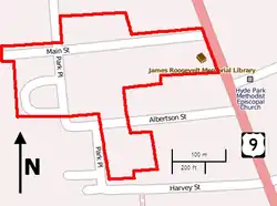The Main Street–Albertson Street–Park Place Historic District is located in the residential neighborhood just west of US 9 near central Hyde Park, New York, United States. It is a predominantly residential area of 6.8 acres (2.8 ha) along the named streets, also including Hyde Park's library and a few former church buildings since converted into houses.