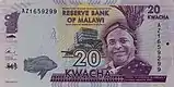 The kwacha (/ˈkwæə/; ISO 4217: MWK, official name Malawi Kwacha[2]) is the currency of Malawi as of 1971, replacing the Malawian pound. It is divided into 100 tambala. The kwacha replaced other types of currency, namely the British pound sterling, the South African rand, and the Rhodesian dollar, that had previously circulated through the Malawian economy. The exchange rate of the kwacha undergoes fixed periodical adjustments, but since 1994 the exchange rate has floated.[3] In 2005, administrative measures were put in place by Bingu wa Mutharika[4] to peg the exchange rate with other currencies.[5] Banknotes are issued by the Reserve Bank of Malawi. In May 2012, the Reserve Bank of Malawi devalued the kwacha by 34% and unpegged it from the United States dollar.[4] The currency was further devalued by 25% by the central bank in May 2022 followed by another 44% devaluation in November 2023 raising inflation rate in Malawi.