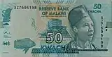 K50 128 × 64 mm Light blue and green Reserve Bank of Malawi headquarters building in Lilongwe; Inkosi Ya Makhosi Gomani II (Philip Zitonga Maseko) Elephants, tree, and safari vehicle in Kasungu National Park