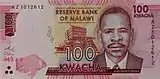 K100 128 × 64 mm Red Reserve Bank of Malawi headquarters building in Lilongwe; James Frederick Sangala College of Medicine in Blantyre; stethoscope