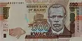 K500 132 × 66 mm Brown and orange Reserve Bank of Malawi headquarters building in Lilongwe; Reverend John Chilembwe Mulunguzi dam in Zomba; water spigot; silhouette of woman carrying container on head and man carrying hoe over shoulder