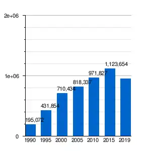 There was a gradual increase of Malaysians migrating to Singapore from 2000 to 2005, increasing from 710,434 individuals to 818,337. In 2010, the total population of Malaysians in Singapore increased to 971,827 and according to the World Bank, Singapore residents, both permanent residents and Singaporean citizens, of Malaysian origin was at a population of 385,979, accounting for 46% of the Malaysian diaspora. It was also estimated that 81% of Malaysian emigrants to all countries from that year were Malaysian Chinese, and 57% of those ethnic Chinese emigrated to Singapore.[20][21] By 2015, the population of Malaysians was at 1,123,654, accounting for 20.3% of Singapore's 5,535,000 population for that year.[22]