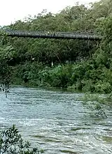 Maldon was also the site of 'Harvey's Crossing', one of two stone causeways over the Upper Nepean River on the Picton - Menangle Road. Stonework supporting the steep approach roads on each side can still be seen. The causeway was replaced by a wooden suspension bridge in 1903, designed by Ernest Macartney de Burgh.[3] By the 1970s, the bridge had become a severe bottleneck, especially with the increasing coal traffic. A deviation of the main road and a concrete beam bridge were constructed further north along the Gorge, and opened in 1980.[4] The Suspension Bridge is now a Heritage item.[5] It is closed to all traffic, including pedestrian.