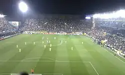 UEFA rebranded and restructured the UEFA Cup in 2009, resulting in it becoming the UEFA Europa League. By finishing fifth in the 2009–10 Premier League, Manchester City qualified for this competition. A play-off round took place before the four team group stage, in which Manchester City beat Timișoara of Romania home and away.[62] City's group stage opponents were Juventus, Red Bull Salzburg and Lech Poznań. Each team played the others twice. City's opener was in Salzburg, and resulted in a 2–0 win.[63] A 1–1 draw at home to Juventus then followed.[64] A 3–1 win at home to Lech Poznań is remembered primarily not for the action on the pitch, in which Emmanuel Adebayor scored a hat-trick, but for the actions of the Polish supporters, whose backs to the pitch dance was later adopted by Manchester City fans, for whom it became known as The Poznań.[65] The return match with Lech Poznań resulted in a 3–1 defeat, but a 3–0 home victory over Red Bull Salzburg ensured qualification with a match to spare.[66] The dead rubber against Juventus ended 1–1, and Manchester City won the group.[67] In the knockout stages City then beat Aris Thessaloniki 3–0 on aggregate,[68] and met Dynamo Kyiv in the last 16. City lost 2–0 in Kyiv, and had to play most of the second leg with ten men after Mario Balotelli was sent off. A 1–0 win was insufficient to overcome the deficit, as City lost 2–1 on aggregate.[69]