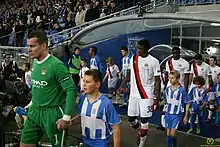 By the 2002–03 season, Manchester City were back in the Premier League. An unusual route into European competition for the 2003–04 season was provided by the UEFA Respect Fair Play ranking, which allocated extra UEFA Cup qualifying round places for the leagues with the best records for discipline and positive play.[45] This marked Manchester City's first European participation for 24 years. In the qualifying round City played Welsh club Total Network Solutions. The first leg was the first-ever competitive match at Manchester City's new ground, the City of Manchester Stadium. Trevor Sinclair became the first ever goalscorer at the stadium in a 5–0 win.[46] In the hope of attracting a large crowd, TNS switched the second leg to Millennium Stadium, the national stadium of Wales.[47] With the tie effectively won, City made 10 changes to their team.[48] The match finished 2–0 to City. Against Sporting Lokeren in the first round proper, City won the home leg 3–2, and the away leg 1–0.[49] A tie against Groclin Dyskobolia followed. Both legs were drawn,[50] and just as in 1976, City were eliminated on away goals after a 0–0 draw in Poland.