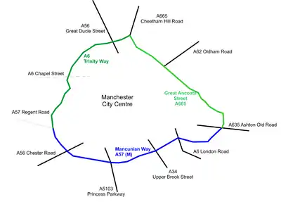 The principal section of Trinity Way opened in 1987 easing congestion on Deansgate and opening a route north-west of the city centre. During 2019-2021, improvements were made to Great Ancoats Street north-east of the city centre, making it mostly dual carriageway.[1]