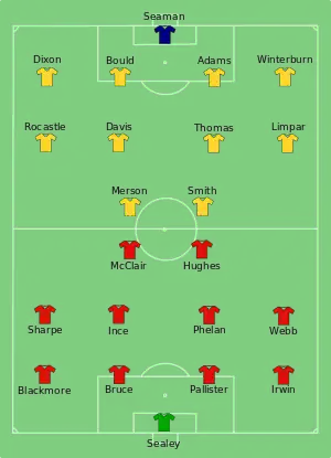 United created the first significant opportunity of the game, around the midway point of the first half, when a header from Steve Bruce was inadvertently cleared by his own teammate McClair in the Arsenal goal.[18] In the meantime, Arsenal manager George Graham spotted that the marking in midfield was poor and instructed Limpar and Rocastle to push forward, while striker Paul Merson was given a deeper role to follow Mike Phelan.[18] Arsenal took the lead two minutes before half-time; Limpar made a run across United's penalty area to receive Paul Davis' corner from the right hand side. United "clearly believed this was a dummy run", hence why Phelan made no attempt to challenge.[19] Davis passed the ball short to Limpar, who turned and curled it goalwards into the penalty area with his left foot. Although goalkeeper Les Sealey "did well to get down to the ball", he was unable to hold it; referee Keith Hackett deemed the ball to have crossed the goal line and gave the goal.[9] Ferguson offered no complaints about Hackett's decision afterwards: "The video showed quite clearly the referee was right and the ball crossed the line."[9]