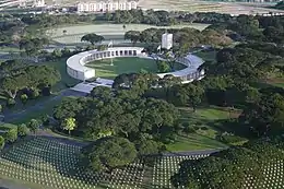 The cemetery, 152 acres (62 ha) or 615,000 square metres in area, is located on a prominent plateau, visible at a distance from the east, south and west.[2] With a total of 17,206 graves, it has the largest number of graves of any cemetery for U.S. personnel killed during World War II and holds war dead from the Philippines and other allied nations.[2] Many of the personnel whose remains are interred or represented were killed in New Guinea, or during the Battle of the Philippines (1941–42) or the Allied recapture of the islands.[2] The headstones are made of marble which are aligned in eleven plots forming a generally circular pattern, set among a wide variety of tropical trees and shrubbery.[2] The Memorial is maintained by the American Battle Monuments Commission.