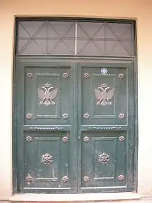 Maniots, known for their martial traditions, were the very first to join the Greek liberation movement (a claim shared with many other Greek areas) and their contribution proved to be pivotal. The society called the Filiki Eteria sent their representatives Perrevos and Chrisospathis to organize the Maniots.[59] On March 17, 1821, 12,000 Maniots gathered in the church of the Taxiarchs (Archangels) of the town of Areopoli and declared war against the Ottoman Empire, preceding the rest of Greece by about a week.[60] Their flag was white with a blue cross in the center. Atop the flag was the motto "Victory or death". The Maniots were responsible for writing "Victory" and not "Freedom" on their banner, since Mani was always free. At the bottom of the flag was an ancient Spartan inscription, "With the shield or on the shield."[61]