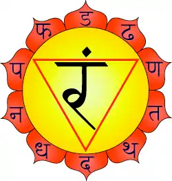 The Manipuraka chakra is said by the 10th century Kubjikamatatantra 11.35 to be at the navel.[9] The Samgitaratnakara 2.125-127 agrees it is at the navel, stating that it has 10 petals, containing deep sleep, desire, envy, slander, shame, fear, compassion, stupor, impurity, and anxiety. The breath (prana) that dwells there is named the sun.[10]